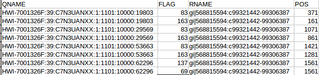OK the fist four column. The QNAME (seq name) and RNAME (reference name) are pretty self explanatory. The FLAG uses information dense bit-wise encoding containing information on the alignment, such as the strand, if the pair mapped, if this if the first or second pair. If your dumb like me you’ll be thankful for the Broads has a nifty website that translates these numbers into plain English. For example, the 83 represents “read paired”, “read mapped in proper pair”, “read reverse strand”, “first in pair”. The 163 is “read paired”, “read mapped in proper pair”, “mate reverse strand” and “second in pair”. I think that makes sense. For reference the other two numbers are 137 (read paired, mate unmapped) and 69 indicating an unmapped read pair. Very cool. The final flag here POS corresponds to the alignment coordinates. We can confirm the reads are ordered R1 then R2 based on the mapping coordinates (see the figure at the top of the page).