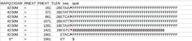 The next flags worth looking at are the MAPQ and CIGAR strings. The mapping quality is represented as a log transformed probability of mapping to the wrong position. Interestingly, the low quality (fastq quality “$”) has the same mapping score as the other high quality reads. I gather this is because the read really can only go one place when there is a 100% match and the reference is only short like this. The CIGAR string starts with a letter, in this case “M” for “alignment match” and 50 indicating the length of the alignment. The “*” indicates that no information is available. PNEXT is the position of the mate pair and TLEN is the observed template length, in other words the length of the sequenced fragment represented by the pairs.
